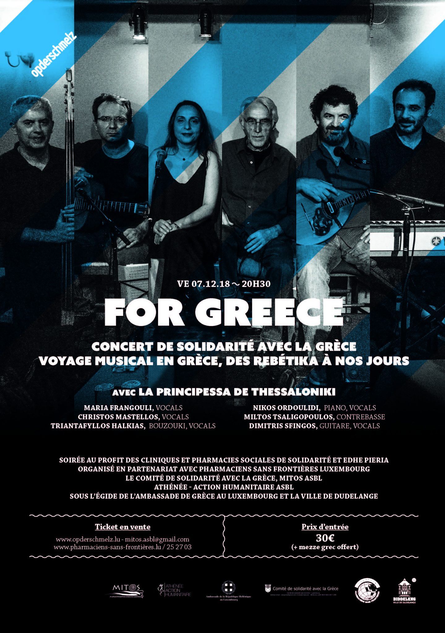 Elle est patronnée par l'Ambassade de la République Hellénique au Luxembourg et de la Ville de Dudelange. Les tickets sont en vente aux lieux habituels mais aussi chez Pharmaciens sans frontières: Cette adresse e-mail est protégée contre les robots spammeurs. Vous devez activer le JavaScript pour la visualiser. -T.252 703 et chez MITOS asbl - Cette adresse e-mail est protégée contre les robots spammeurs. Vous devez activer le JavaScript pour la visualiser.