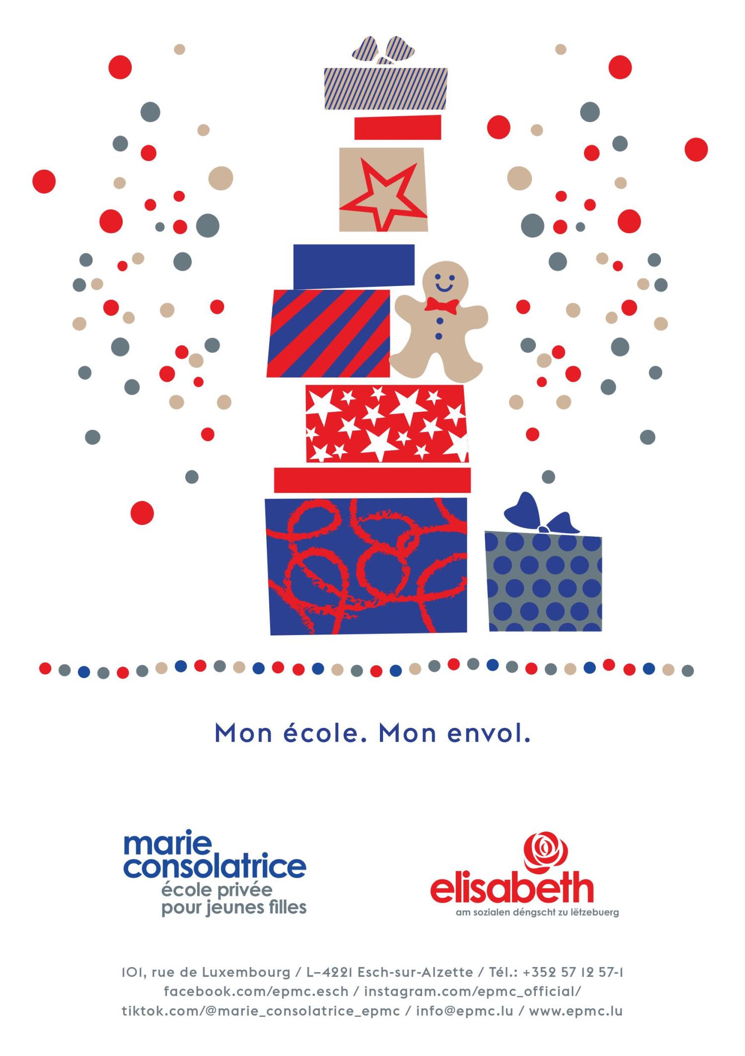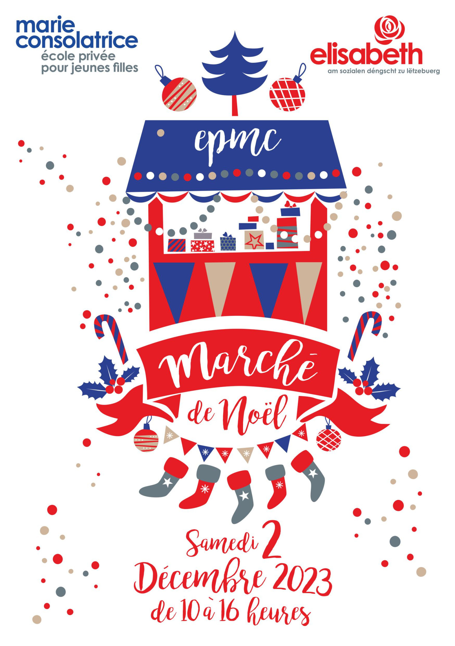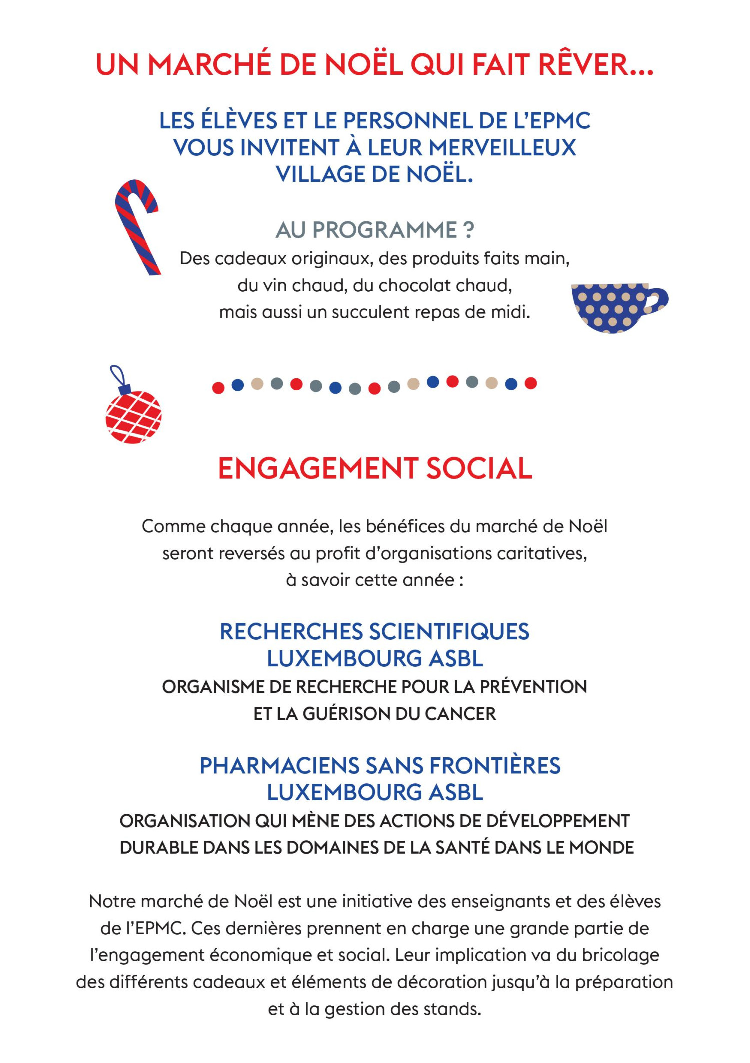 Le 2 décembre 2023, les élèves et le personnel de l'Ecole Privée Marie-Consolatrice organisent un Marché de Noël "qui fait rêver" au profit de "Recherches Scientifiques Luxembourg Asbl" et "Pharmaciens sans Frontières Luxembourg Asbl".