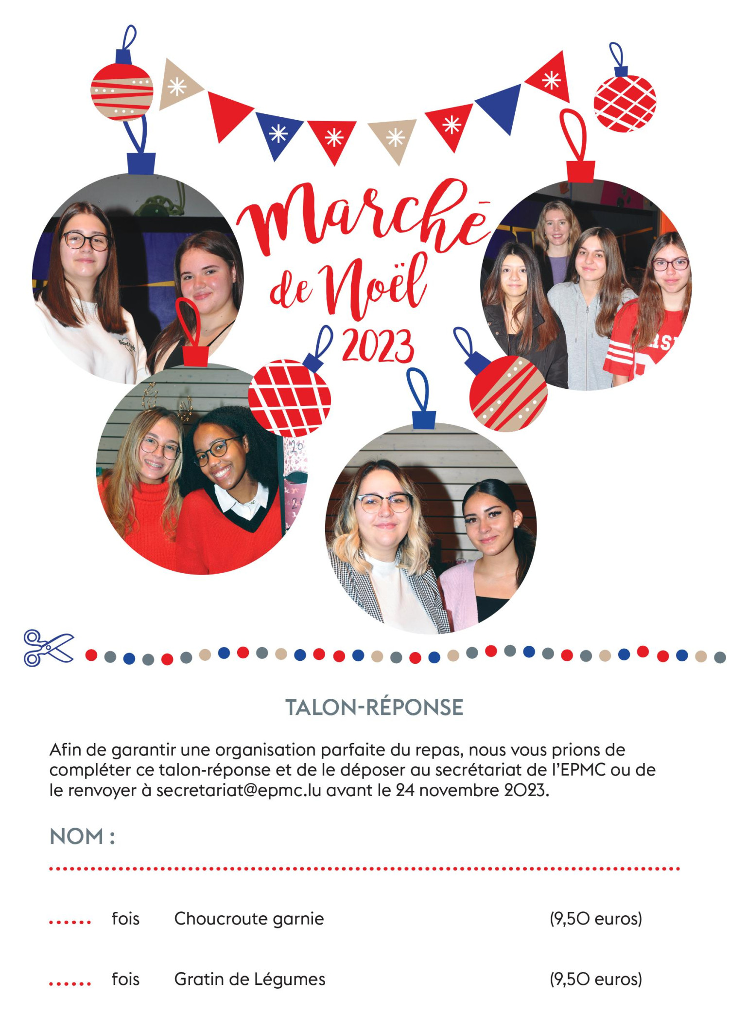 Afin de garantir une organisation parfaite du repas, vous pouvez envoyer votre réservation à Cette adresse e-mail est protégée contre les robots spammeurs. Vous devez activer le JavaScript pour la visualiser. avant le 24.11.2023 pour ou bien la Choucroute garnie (9,50 EUR) ou un bon Gratin de Légumes (9,50 EUR).