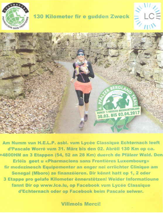 Nous remercions vivement les élèves engagés du LCE, ainsi que Mme Pascale Worré, pour le chèque de 6000 € au profit de notre projet «Amélioration de l’offre et de la qualité des soins du Dispensaire Notre Dame de MBoro (Sénégal)». Une grande partie de ce montant a été collectée par les sponsors de Mme Worré pour sa participation au "Pfälzer Berglandtrail", mais aussi lors du Sponsored Run, une action d'une grande valeur éducative organisée chaque année par le LCE.