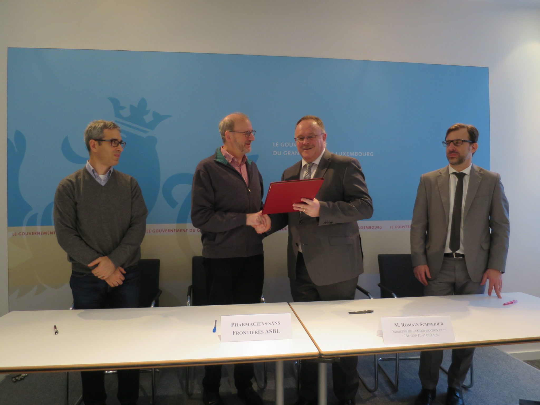 En date du 11 janvier 2018, Pharmaciens sans frontières a signé son accord-cadre avec le Ministère de la Coopération et de l'Action humanitaire, en présence de M. Romain Schneider, ministre de la Coopération et de l'Action humanitaire.