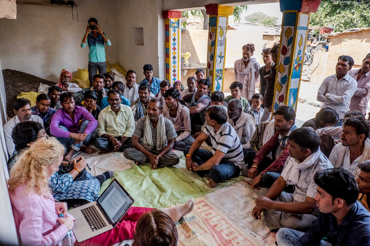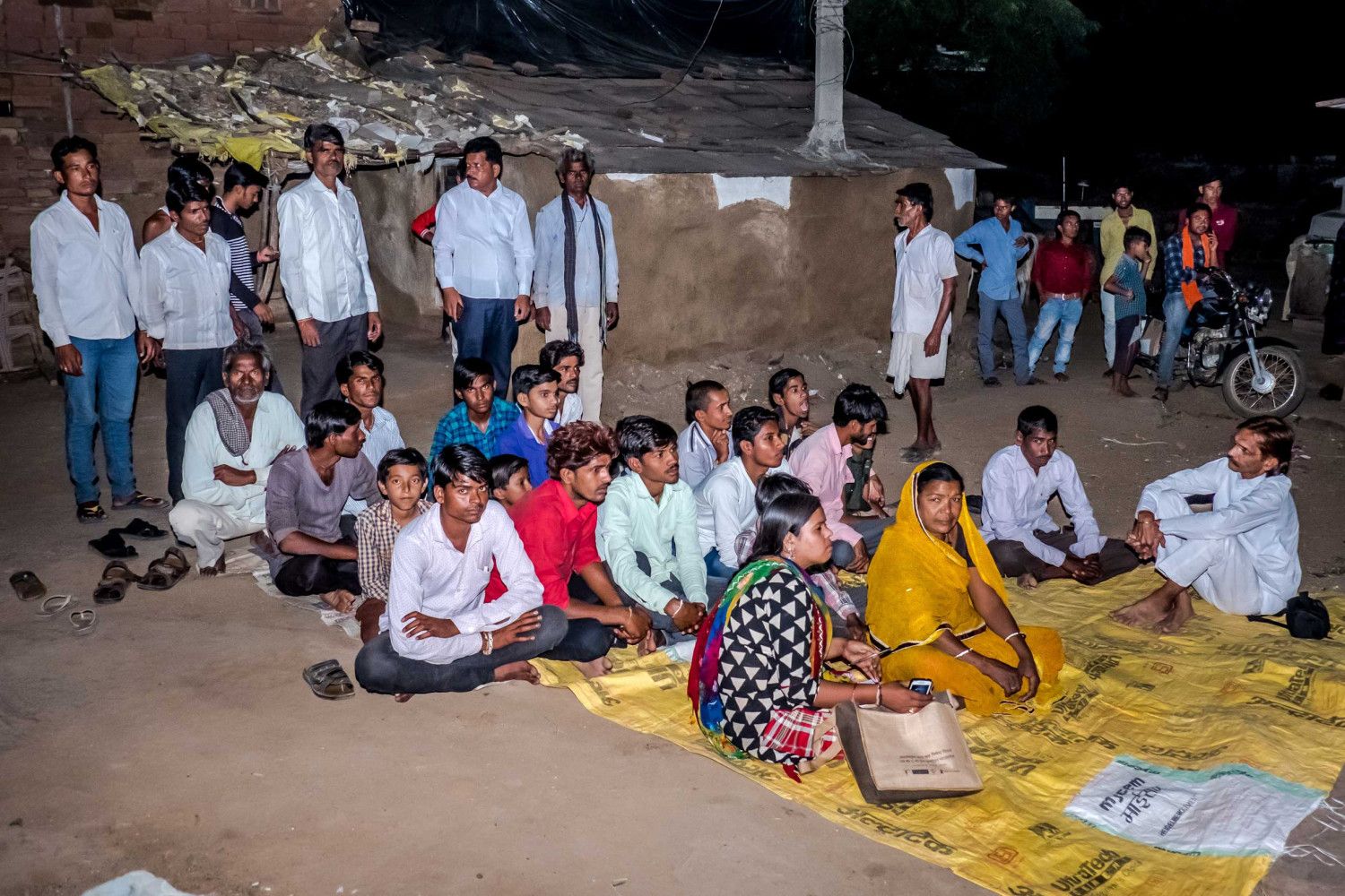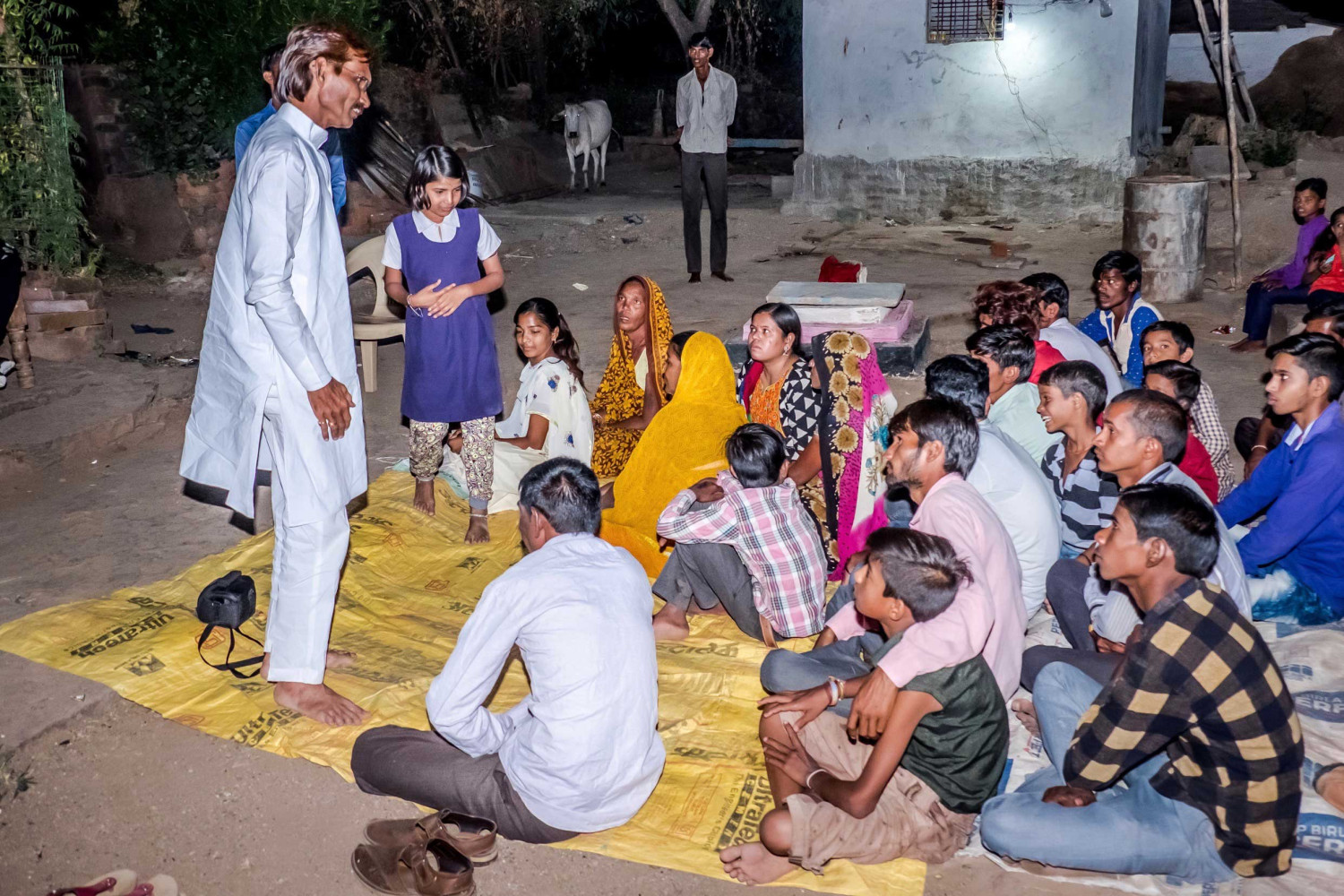 Réunions avec les groupes d’hommes, de femmes, d’enfants. Certaines réunions ont lieu le soir à la tombée de la nuit pour que tous ceux qui travaillent puissent se joindre au groupe par la suite. Ici, le directeur de l’ONG locale fait un discours sur l’importance de l’hygiène et des visites médicales régulières en cas de maladie.